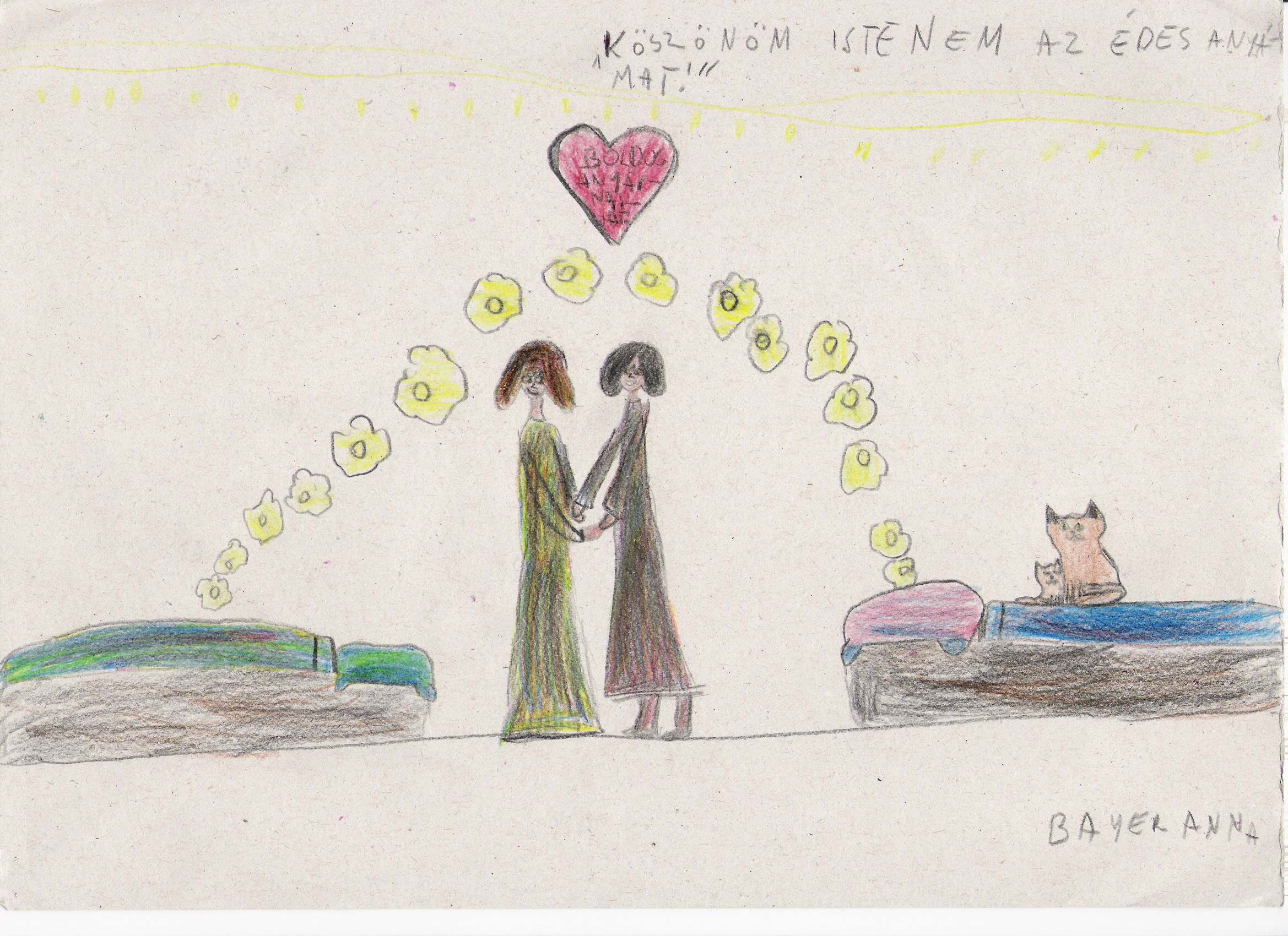 A rajz mégis békés, szeretettel teli, igazi anyák napi rajz, amin a szeretet és az egymásra figyelés uralkodik.