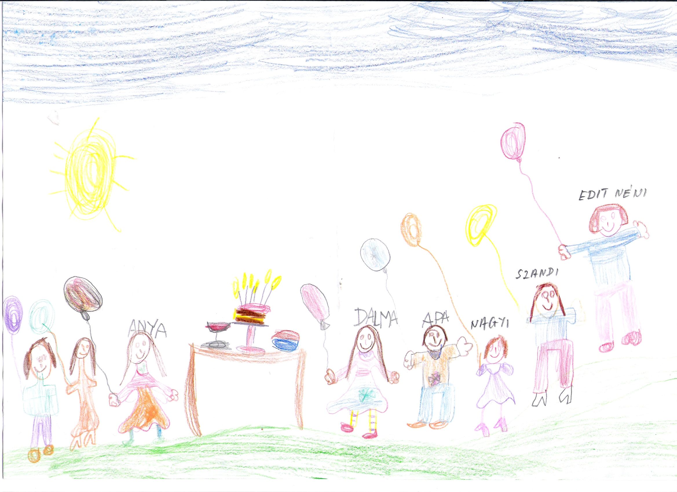 Érdekes a nagyi levendula lila színbe öltöztetése. ( talán a régi, levendula illatú 4711-es kölni a kedvence?) A szeretetet sugárzó Nap is az anyai oldalon látható. Az egész rajz azt jelzi, hogy Dalma szereti a biztos talajt a lába alatt, szinte csak a lap egyharmadát rajzolja be, egyedül Edit néni emelkedik kicsit magasabb régiókba, a szellemi szféra felé. Talán tőle hall olyan dolgokat a kislány, ami kicsit kiemeli a hétköznapok világából. Ő is érzi, hogy nagyon üres fent a lap, - vélelmezhetően a szellemiek irányába, a tudás birtoklása felé még nem nyújtogatja a karjait, - jól érzi magát az őt körülvevő, körülölelő körülmények között és szépen, harmonikusan bekékíti a rajz felső részét, hogy valamennyire helyreállítsa a képi egyensúlyt.