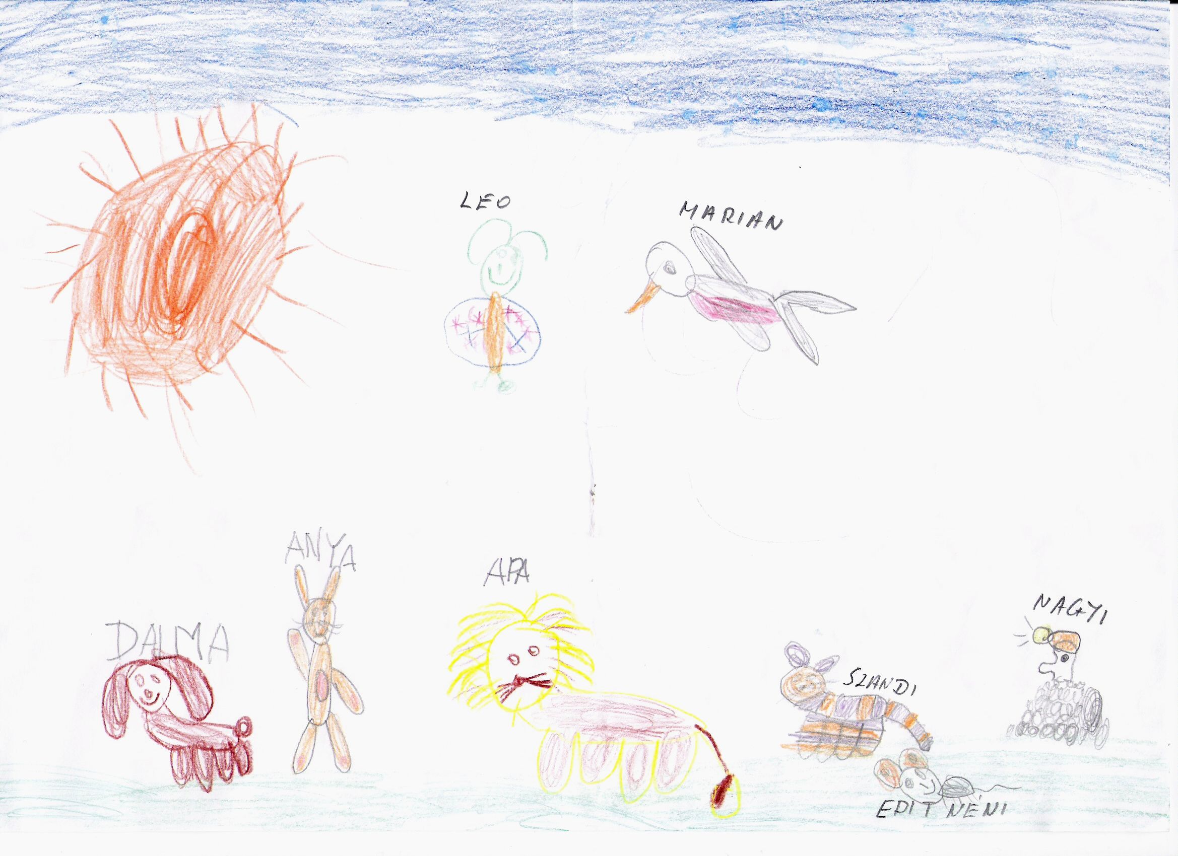 Az édesapát bár oroszlánnak ábrázolta, ez az oroszlán nagyon bizonytalan, szinte nincsenek is körvonalai. Olyannak tűnik a rajz alapján, mint aki szeretne oroszlánként fellépni, de nincs meg hozzá az ereje. A leghangsúlyosabb az oroszlánon a bajusza, és a farka, vagyis a férfias értékei, bár az oroszlán majdnem, hogy behúzza farkát. De a szája nem látszik, nem szokott oroszlán módjára üvölteni. Azt nézi, hogy mit is mutat a nyuszi. Nagyi báránynak látszik, bizonyára szelíd, aranyos néni. Szandi erőteljes macskának van ábrázolva, aki már-már tigrisként jelenik meg, vagyis harcias kis hölgy lehet. Bezzeg Edit néni kisegérként „lapos kúszásban” közlekedik ebben a társaságban.