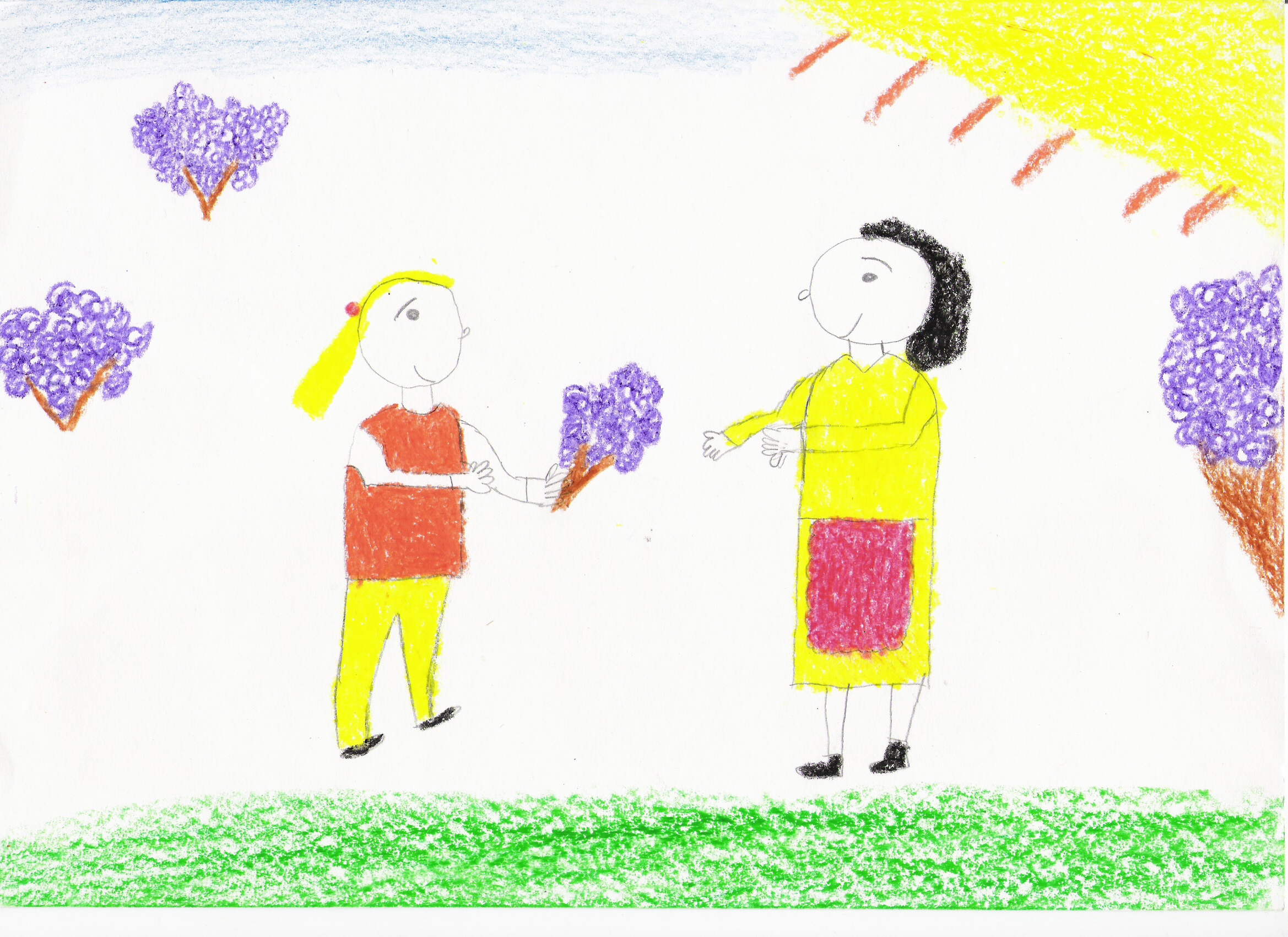 A rajz mégis békés, szeretettel teli, igazi anyák napi rajz, amin a szeretet és az egymásra figyelés uralkodik.