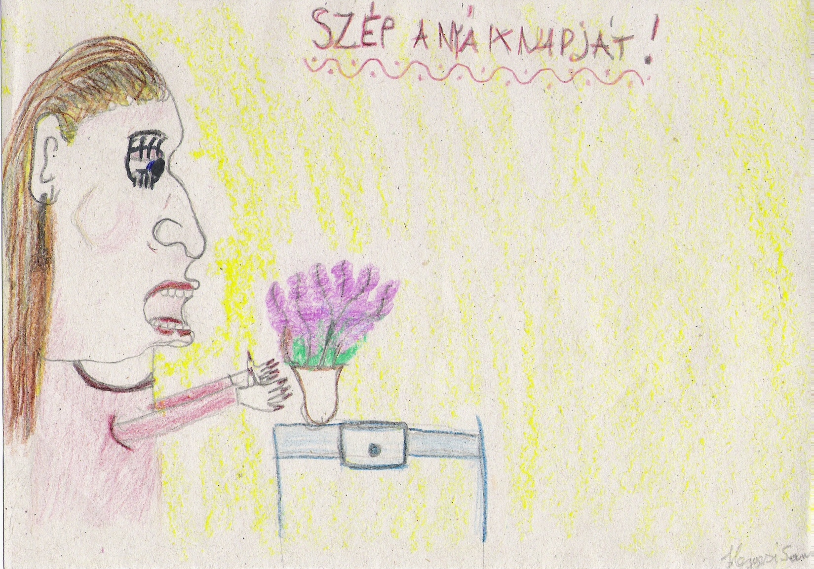Nem lehet igazán könnyű dolga ennek a kislánynak az általa ábrázolt anyjával, aki a rajz szerint nem éppen szeretni való, inkább félelmetes. Ennek ellenére ő ad a formára, a külsőségekre, ahogyan szokás, ő is megajándékozza az anyukáját egy anyák napi rajzzal, de az alkotáson látszik, hogy nincs köztük bensőséges kapcsolat, hiányzik az öröm, a szeretet a rajzról.